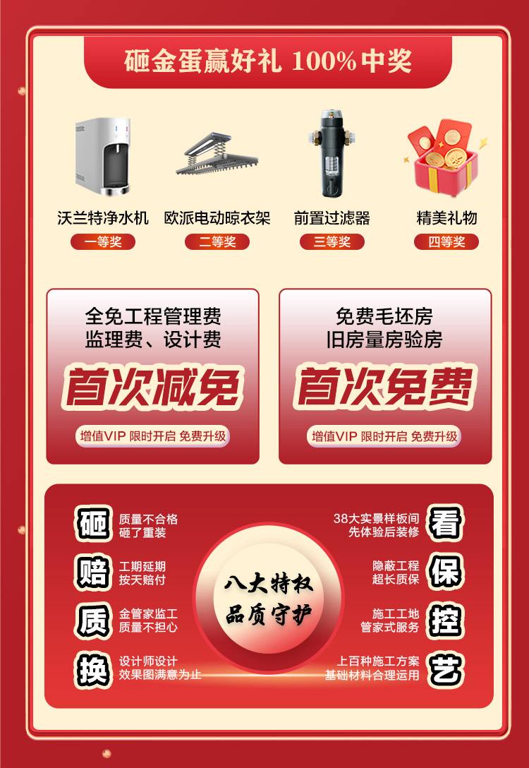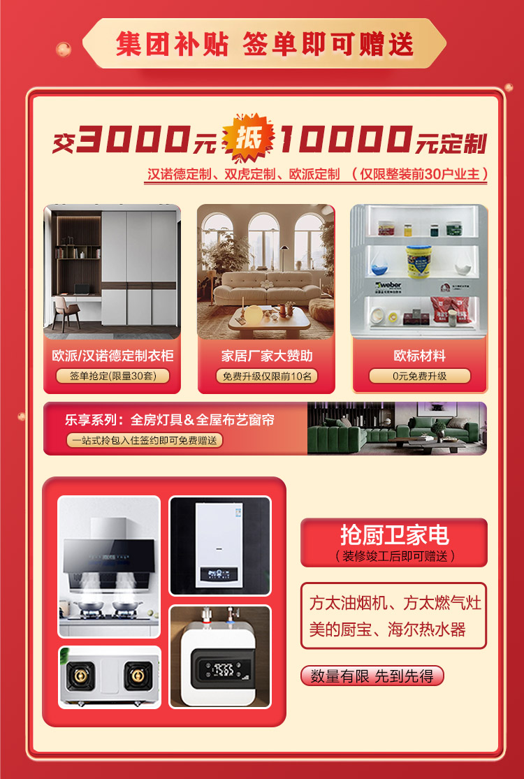 為表達(dá)我們的誠(chéng)摯謝意,本次活動(dòng)推出3000元抵10000全屋定制系列升級(jí),并且簽約即可贈(zèng)送全屋燈具窗簾,更有廚衛(wèi)家電限時(shí)相送,另外我們精心準(zhǔn)備的簽約砸金蛋中大獎(jiǎng),100%中獎(jiǎng)率。